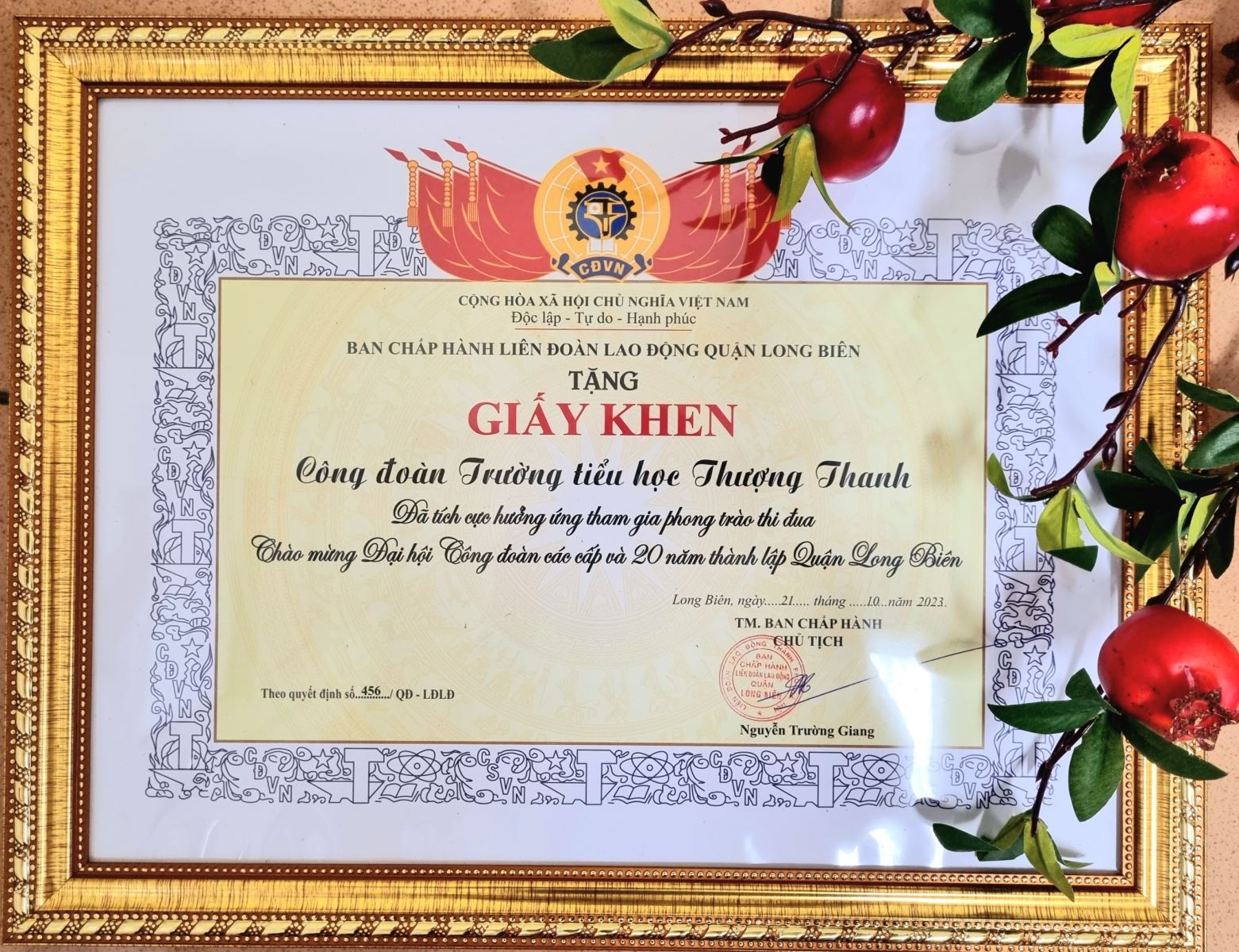 LĐLĐ quận Long Biên đã khen thưởng 121 lượt tập thể, cá nhân có thành tích xuất sắc trong 3 nội dung: đợt thi đua chào mừng Đại hội công đoàn các cấp và chào mừng 20 năm thành lập quận Long Biên; chương trình 1 triệu sáng kiến giai đoạn 2; Cuộc thi tìm hiểu 20 năm xây dựng, phát triển Quận Long Biên và LĐLĐ quận. Công đoàn Trường Tiểu học Thượng Thanh vinh dự nhận Giấy khen với hai nội dung “Đã có thành tích xuất sắc tham gia chương trình “1 triệu sáng kiến – Nỗ lực vượt khó, sáng tạo, quyết tâm chiến thắng địa dịch Covid-19” và “Tích cực hưởng ứng tham gia phong trào thi đua Chào mừng Đại hội công đoàn các cấp và 20 năm thành lập quận Long Biên”.